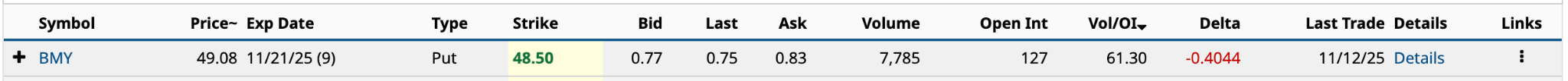 Although Bristol-Myers Squibb (BMY) had six unusually active options yesterday, I'm interested in the Nov. 21 $48.50 put. It had the fifth-highest Vol/OI ratio on the day.
