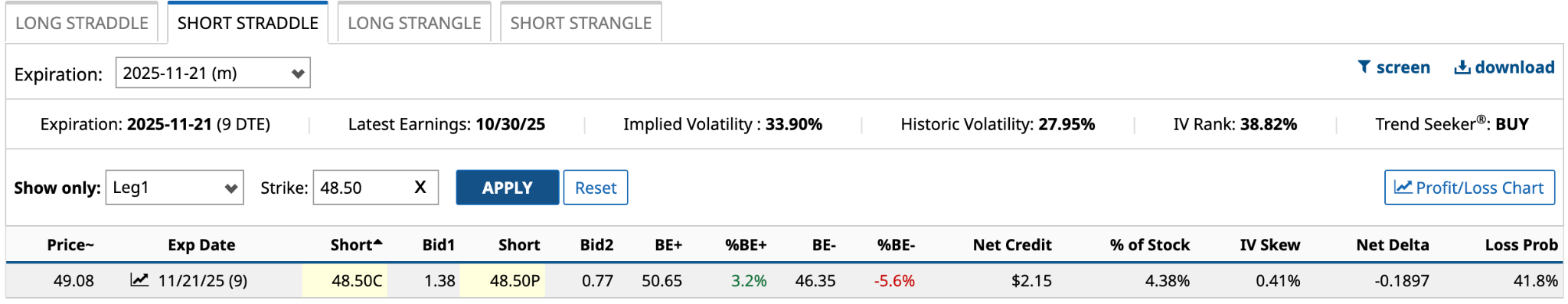 As long as the shares remain between the upper breakeven of $50.65 and the lower breakeven of $46.35. You would achieve the $215 maximum profit if the share price equals the $48.50 strike price at expiration. It’s important to note this trade is not without risk. Should news surface to move the share price above the upper or lower breakeven, the loss is unlimited. That said, it’s improbable, if not impossible.