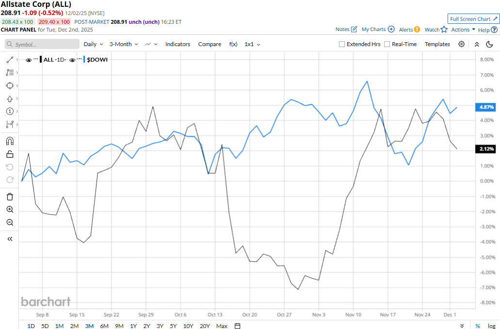 Allstate touched its all-time high of $215.89 on Nov. 21 and is currently trading 3.2% below that peak. Meanwhile, ALL stock prices have observed a 2.7% uptick over the past three months, slightly lagging behind the Dow Jones Industrial Average’s ($DOWI4.8% gains during the same time frame.