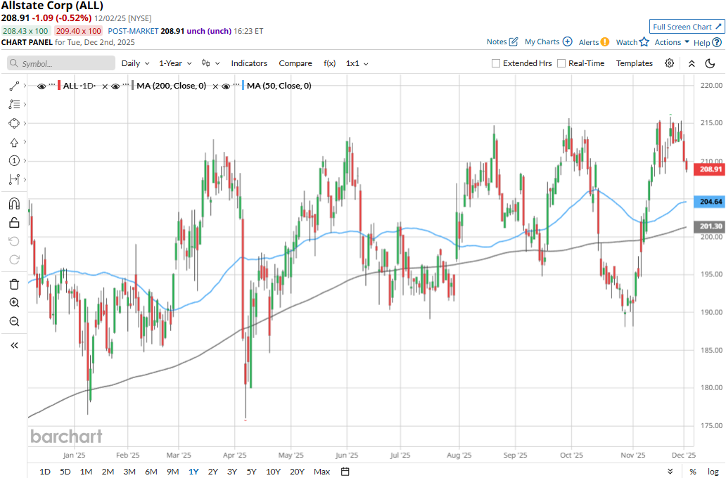 ALL stock has traded along its upward-sloping 50-day moving average and mostly above its 200-day moving average over the past year, with some fluctuations, underscoring its bullish trend.